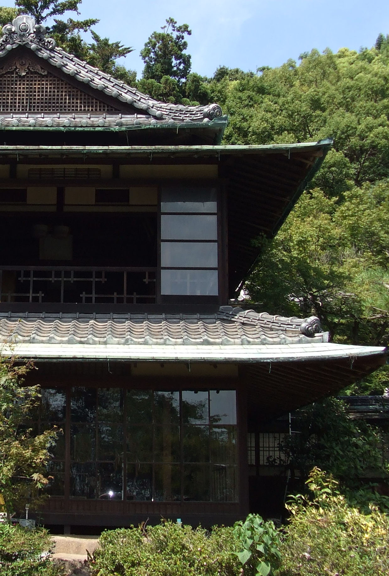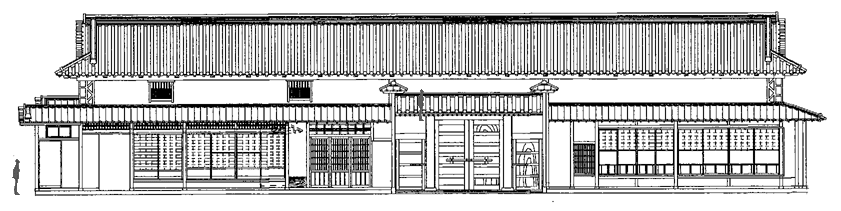木造2階建て(厨子2階で2階は物置)の上屋根は人母屋造り桟瓦葺きとなっており下屋根は桟瓦葺きで軒先1030mm幅は銅板葺きとなっている。軒の出は跳ね木により1930mm程度あり、茅負、木負。地垂木により厚みのある屋根となっいるが桟瓦の使用により俊爽な雰囲気がある。