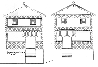 外壁は、白漆喰塗り(一部割竹縦張り)とし、中央部からやや右寄りに玄開、6帖の取次の間を設ける。取次の間の右手に
