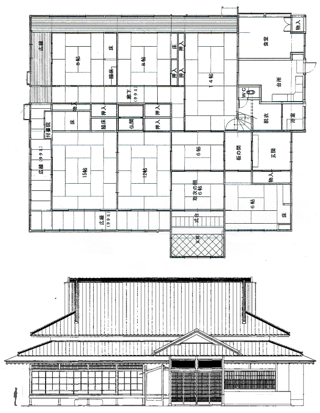 南面1階は桁行10間、梁行8間の規模で、後に東側で桁行半間、梁行4間の増築とともに、台所、食堂、脱衣、浴室、WCが、アルミサッシや乾式新建材にて改修されている。外壁もこの部位はモルタル仕上げとなっている。表玄関の軒は吹寄垂木の化粧木舞天井で、玄関内部は四半張りの白御影石貼床で式台を備えた格式の高い構えとなっている。