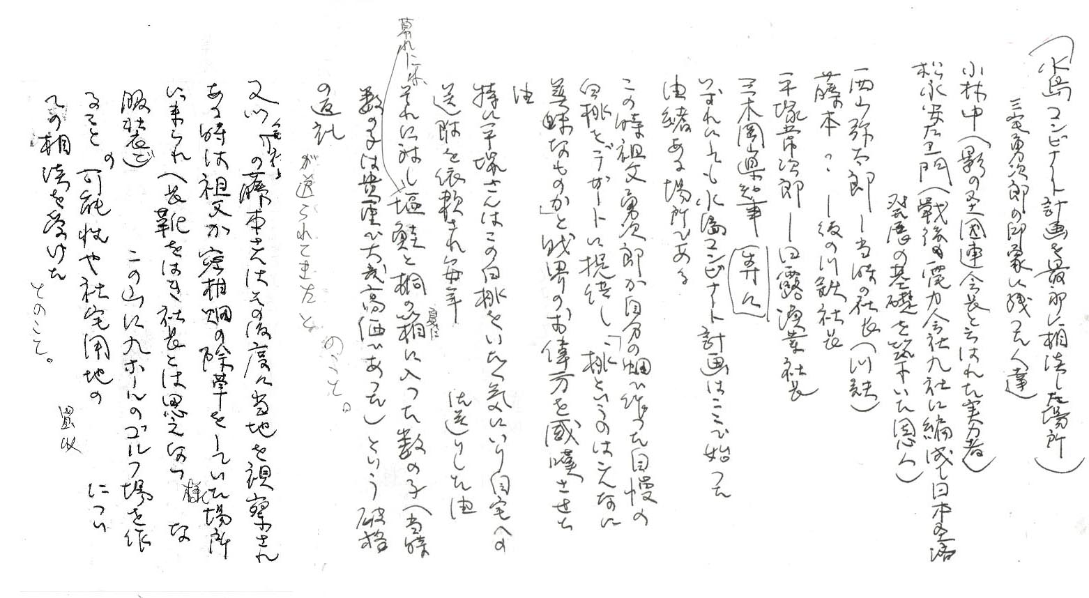 昼食会後のデザートとして、勇次郎が、三宅農園で栽培していた清水白桃を出したところ、平塚氏は「こんなうまい桃は初めて」とたいへん感激した、これが縁で以後毎年7月に清水白桃を送り、その返礼として、暮れに新巻鮭と数の子が、勇次郎が亡くなるまで送られてきていた。また、勇次郎が農園で農作業をいているところに、藤本氏が突然来て、「三宅さん、ここへ、9ホールのゴルフ場はできませんか」等、相談を受けた・・・