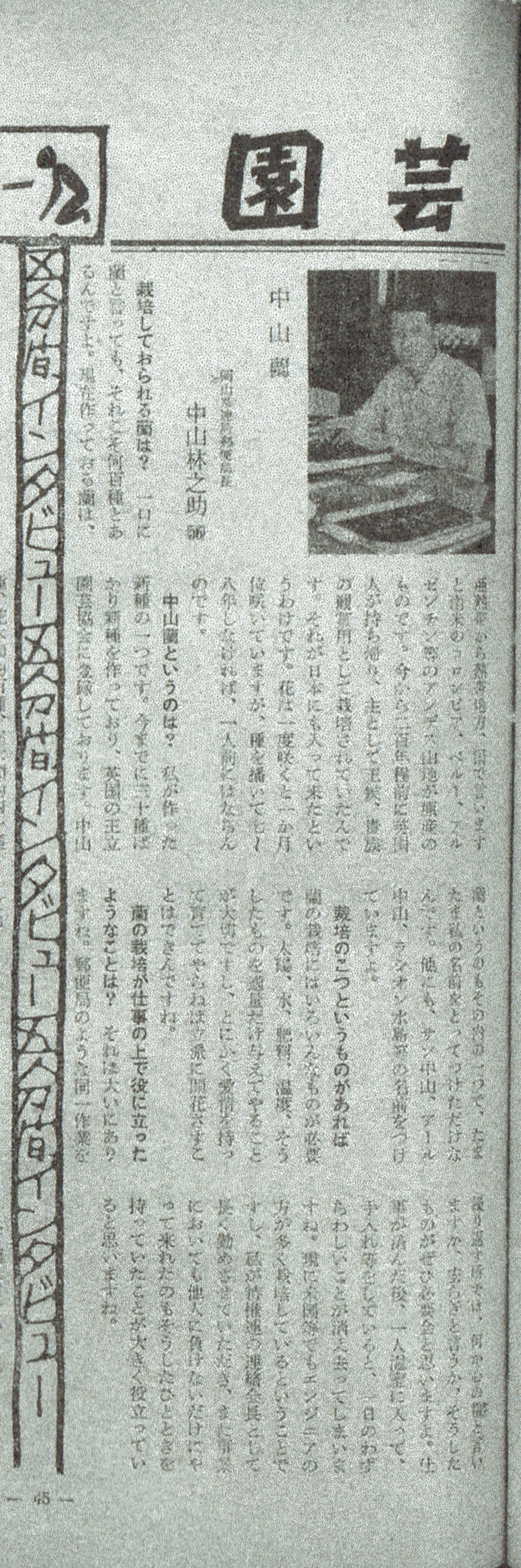●日本郵政公社(現日本郵便㈱)の社内報「郵政」の1967(昭和42)年10月号の五分間インタビュー記事です。園芸愛好、特に蘭の愛好家としての紹介です。表題の「中山蘭」は、文中に示すように氏の作出した交配種の名前ですが、その詳細は不明です。サン中山、アール中山、ラシオン水島は、RHS登録が確認できます。