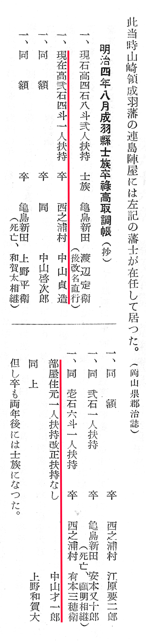 ●明治2年、版籍奉還が実施されます。藩主山崎冶祇(はるよし)は知藩事になり、中山家は卒族(のちに士族)になります。明治4年、才一郎22才で廃藩置県、壬申戸籍を経験します。成羽藩が成羽県に変わり、知藩事は罷免され、代わって中央政府から県知事が送り込まれます。すでに、主従関係はなくなっていましたが、残っていた徴税の仕事もなくなり、無役となります。才一郎は、西浦陣屋で、この激動をどのように捉えたでしょうか。