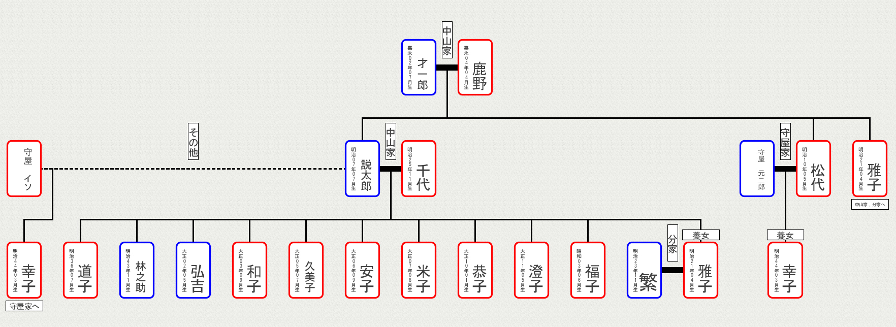 ●説太郎を中心にした中山家の家系図です(人事興信録[大正7~昭和18年]の記述から作成したもの、この資料では説太郎の生年が明治7年になっている、他の資料では明治6年)。
