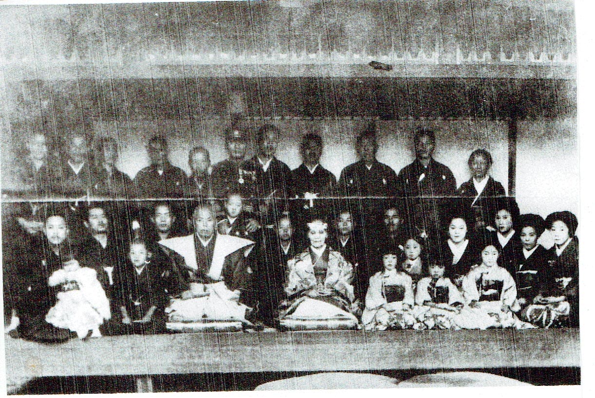 ●大正8年、住宅の落成式がありました、丸2日間ドンチャン騒ぎだった様子が伝えられています。それに兼ねて、説太郎の父母、才一郎(69才)・鹿野(67才)夫妻の金婚式が催されています。最前列左端が説太郎(46才)です、前年に生まれたばかりの五女米子を抱いています。金婚式を祝う風習は、もともと日本社会にはなかったのですが、明治中期にイギリスからもたされたものが急速に広まったようです、中山家は進んで取り入れたのでしょう。才一郎は、裃に脇差、武士の正装です、時代は移っても、心根はまだ武士であったのでしょうか?